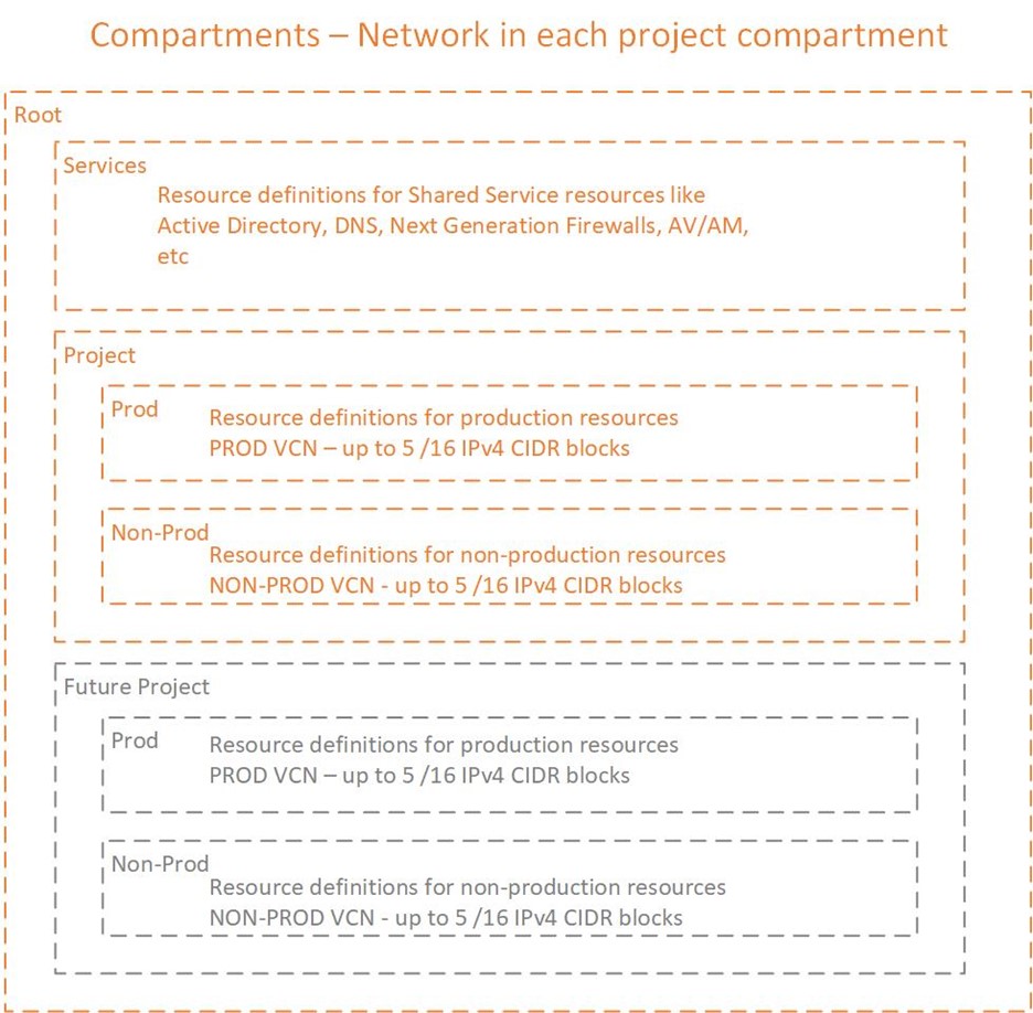 If customers do not like the idea of having a top-level Network compartment, another way to accomplish the segmentation is to deploy the networks within the project compartments. By deploying the VCN into the project compartments/sub-compartments, we can reduce the number of compartments defined in the tenancy. Reducing the number of compartments, can reduce operational overhead (which we discussed in part 1 of this series). One example of the reduced operational overhead would be the reduction in compartments reduces the the time and scope of tenancy scans as there are fewer compartments to traverse within the tenancy.
