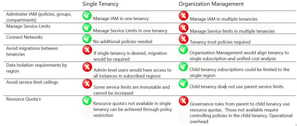 Organization Management made sense for customers that acquired additional OCI tenancies through a merger, as the parent tenancy may have a better pricing discount or by keeping the multiple tenancy approach, eliminates the need for a costly migration. The table below illustrates some of the deltas between single and multiple tenancy operations.