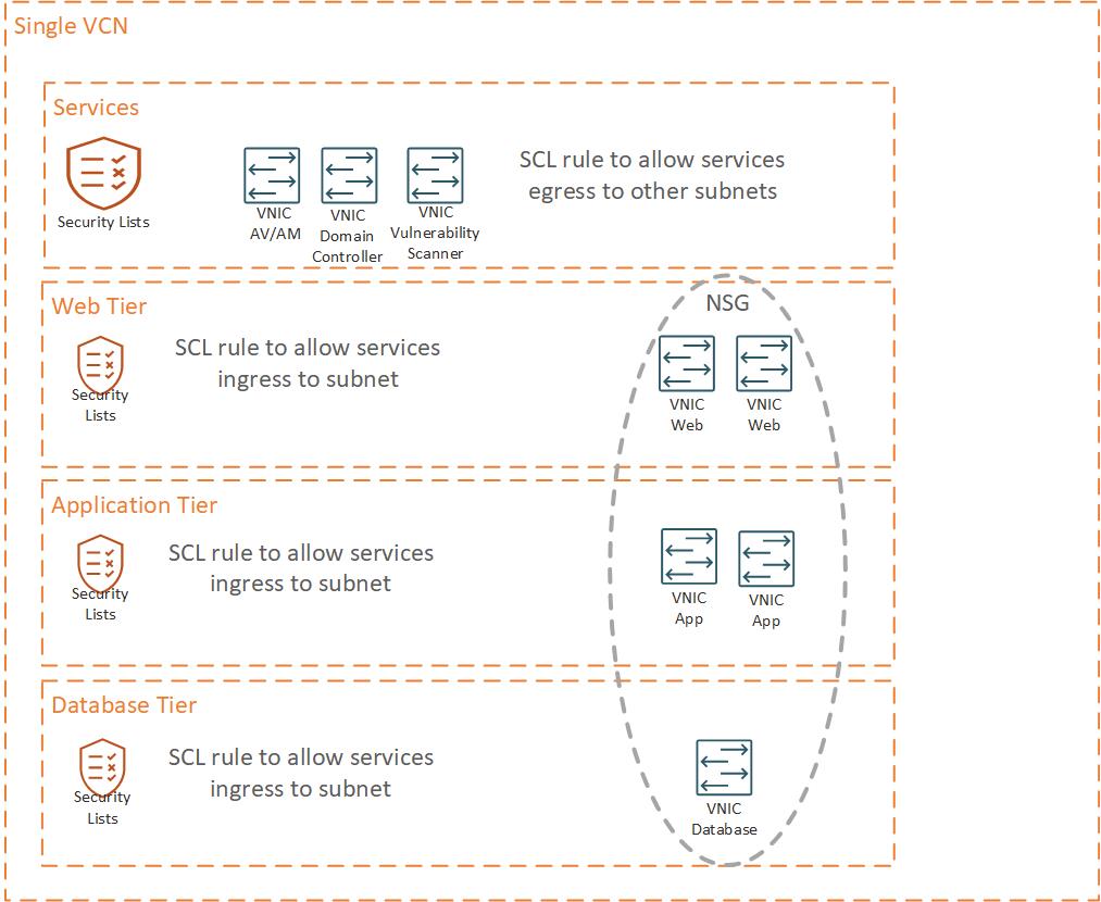 NSG’s were added to OCI long after SCL’s. NSG’s allowed network admin’s to group virtual NIC’s (VNIC’s) together and apply network security rules at a VNIC level rather than subnet wide. NSG’s offered more granular control and allowed network admins to group application VNIC’s together (i.e. web tier, application tier and db tier VNIC’s) and apply network rules specific to the application stack even if the stack spanned multiple subnets. They just have to be in the same VCN.