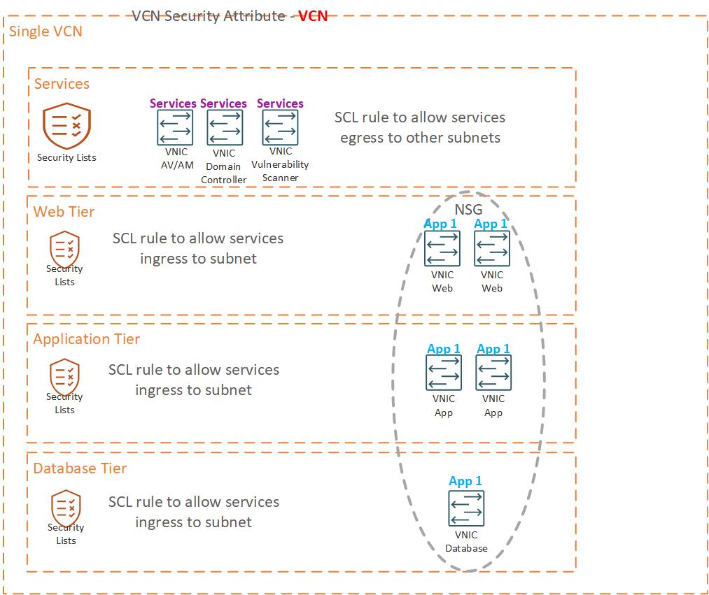The diagram below shows how SCL and NSG can be leveraged together to implement network security controls for Services such as anti-virus and anti-malware (AV/AM), domain controllers (DNS), vulernability scanners, etc to be allowed to access application and database subnets while NSG’s are implemented to implement application stack network controls (traffic between application tiers). It is important to note that while NSG is a grouping of VNIC’s, the NSG assignment is done at the parent component layer (i.e. I have to assign a compute resource to an NSG from the compute resource, I cannot just add the VNIC directly to the NSG)