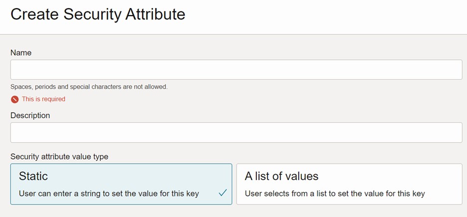 - Security Attribute Value Type – How are standardized and meaningful Security Attribute values being assigned? If the application owners manage the Security Attributes, is there a standardized value added when the security attribute is assigned to an OCI resource? This is where the pre-defined attribute values (dropdown lists), could be of value.